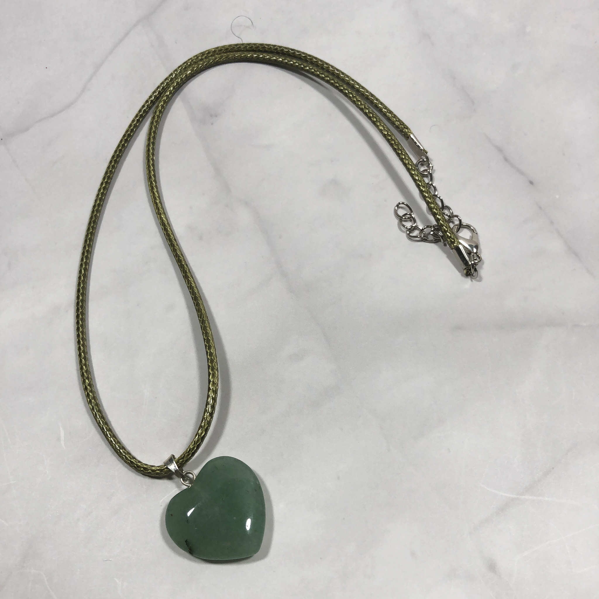 Green Aventurine is a green crystal that ranges from translucent to opaque. Our Aventurine heart pendant leans more towards a deep, rich, opaque green.